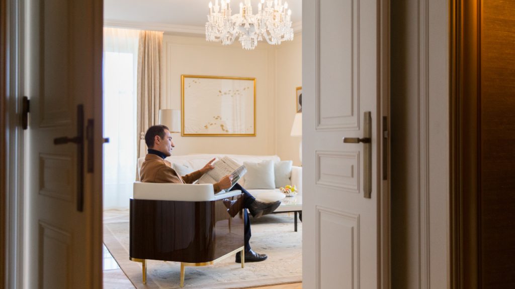 With living areas of sofas and coffee tables and fireplaces, and shelves populated with books and vases, there is a homey feel to the suites – specifically that of a modern Parisian apartment, one of reserved but contemporary taste and a penchant for light, neutral tones and subtle luxuries. The effortlessly relaxed décor makes it easy to miss, but close examinations are rewarding. The silk covering of the headboard is hand painted and embroidered by Fromental. The wall panelling is straw marquetry, courtesy of Lisson de Caunes in Paris. The chandelier is Baccarat, the drawer pulls are by Lalique. The minibar is housed within a lacquered armoire with mother-of-pearl inlays. In the spacious master bathroom, underneath the dual sinks, is a Dyson hair dryer.