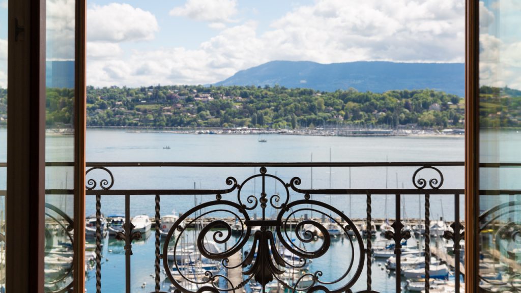 A total of 21 of these suites command lake views. The Woodward is perched on Quai Wilson, one of the city’s lakeside thoroughfares and major arteries; weekday evenings are packed with traffic and sunny weekends are packed with people. A leisure harbour happens to sit right outside the hotel, its bobbing watercraft adding to the scene. Across the lake is the profile of Geneva’s old town, which lights up with innumerable watch brand names during the evening. To the right, one can see the Jet d’Eau, the dramatic water fountain that is Geneva’s most famous landmark. On a clear day, Mont Blanc’s distant peak is visible, and to the left, Lake Geneva stretches out in the direction of Lausanne. Those wrought iron balconies are all readily accessible from inside the suites, behind tall windows and billowy day curtains.