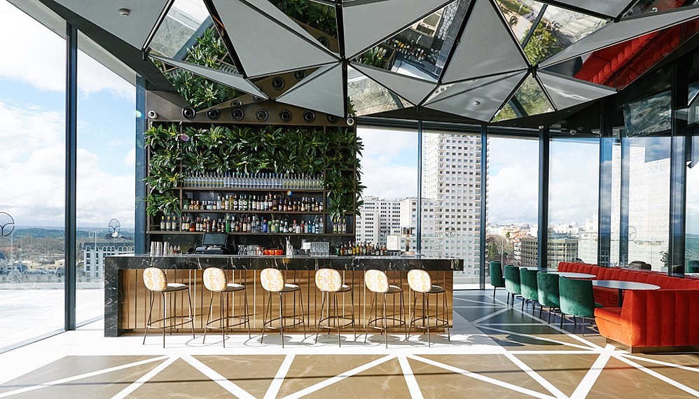 Gifre’s flashy sculpture extends up to the 12th floor — where what appears to be a skylight from the inside reveals itself to be the glass bottom of the hotel’s rooftop pool. The sleek pool and SkyBar area is one of the best places to see-and-be-seen in the city, boasting sweeping views of Madrid and serving up a mix of cocktails both rooted in classics (think mojitos kicked up with eucalyptus soda and tonka beans) and showcasing 21st century mixology (think Dewar’s 12-Year-Old whisky perfumed with chili, lime and cardamom and sweetened with banana sugar). Come dinner time, guests can head inside to Mediterranean-Japanese fusion restaurant Ginkgo, where views of the Madrid skyline are complimented by bold, angular floors and plush velvet seating.
