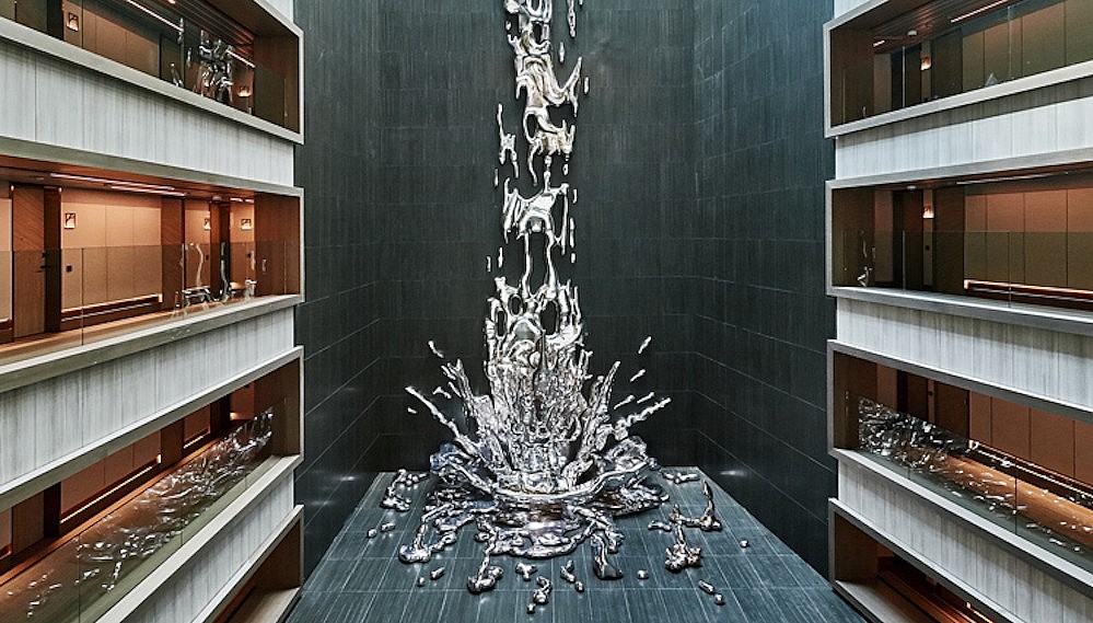 Though the hotel is located within the city’s historic centre — just steps from the Palacio Real, sprawling Casa de Campo park, and the 293-year-old Restaurante Sobrino de Botin (the oldest restaurant in the world) — it’s futuristic metal façade is a beacon of modernity. Inside, Spanish interior design firm Cuarto Interior has created public spaces that lean closer to art gallery than hotel lobby. Varying tones of light woods and subtly textured furnishings serve as a glamorous backdrop for playful gold leaf sculptures by Nacho Zebelu, and bold pieces by Dutch-born artist and architect Jan Hendrix. At the centre of it all is a towering, 24m-tall metal fibreglass waterfall sculpture by Catalan artist Pere Gifre, which tumbles down the wall of an interior courtyard.