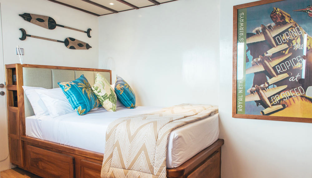 Built using teak and local ironwood, the gorgeous charter-only Phinisi (a traditional two-masted Indonesian sailing boat) is home to five over-water, ensuite cabins that spread across two levels. While it sleeps up to 10 adults, its small capacity matched by eight crew members including Gaz, the cruise director who hails from England.